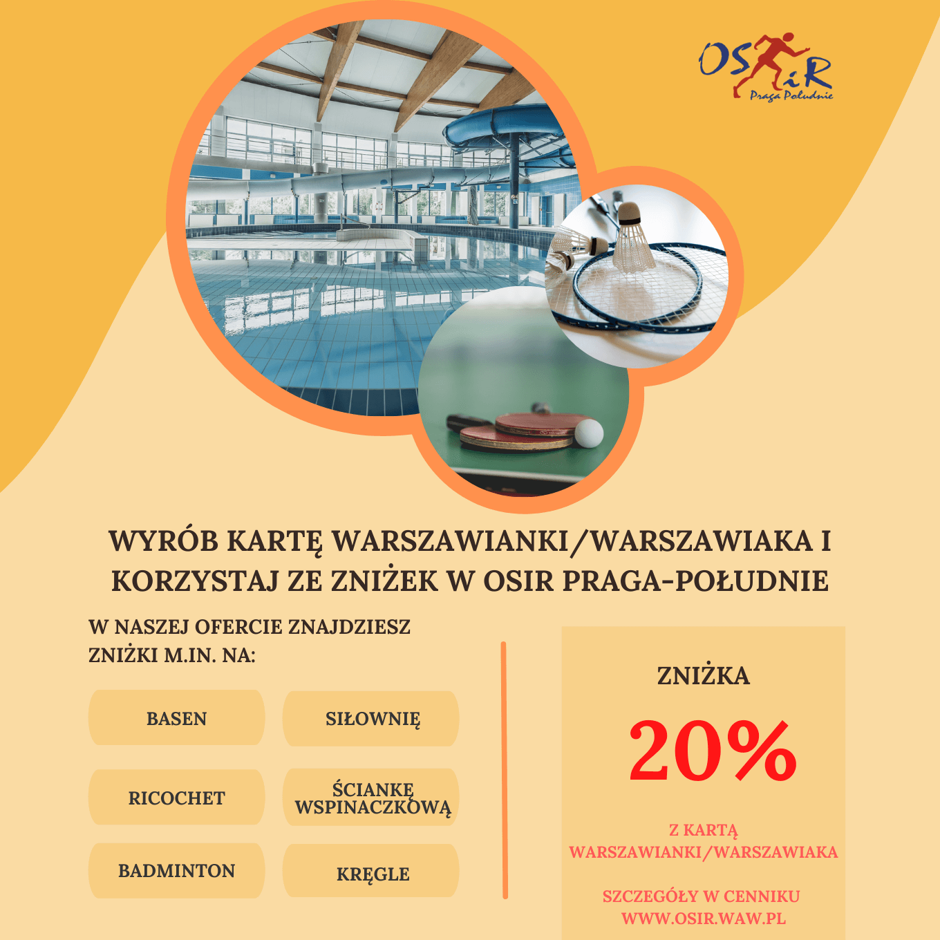 Żeby uzyskać zniżkę 20% na wybrane usługi OSiR Praga-Południe wystarczy okazać Kartę warszawianki/warszawiaka lub Kartą młodego warszawiaka/warszawianki przed dokonaniem zakupu usługi.