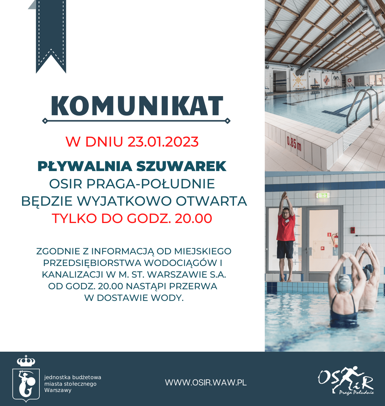 Informujemy, że w związku z przerwą w dostawie wody Pływalnia Szuwarek OSiR Praga-Południe będzie czynna w dniu 23 stycznia tylko do godziny 20.00.