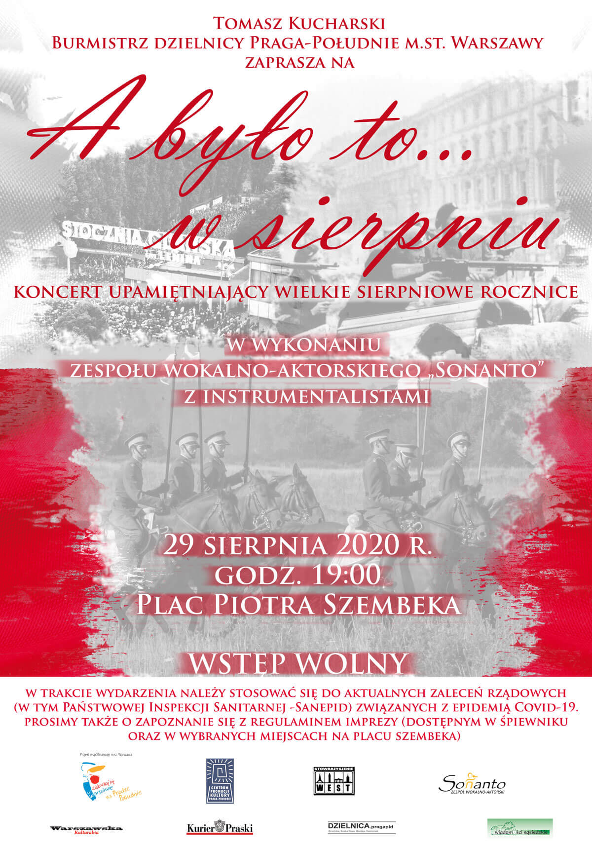 Tomasz Kucharski, burmistrz dzielnicy Praga-Południe m.st Warszawy zaprasza na koncert upamiętniający wielkie sierpniowe rocznice “A było to… w sierpniu” w wykonaniu zespołu wokalno-aktorskiego “Sonanto” z instrumentalistami.