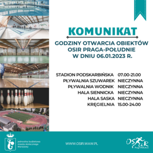 Przypominamy o zasadach działaniach obiektów OSiR Praga-Południe w dniu 6 stycznia 2023 r.