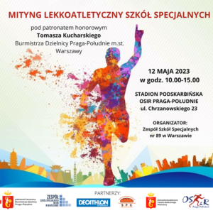 12.05.2023 odbędzie się „Mityng Lekkoatletyczny Szkół Specjalnych” pod patronatem honorowym Tomasza Kucharskiego Burmistrza Dzielnicy Praga-Południe.
