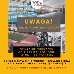 Pływalnia “Wodnik” i “Szuwarek” oraz Hala “Saska” i “Siennicka” będą zamknięte. Stadion “Podskarbińska” (bieżnia) będzie otwarty.