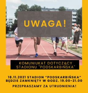 W dniu 18.11.2021 Stadion “Podskarbińska” nie będzie dostępny w godz. 19.00-21. Za utrudnienia przepraszamy.