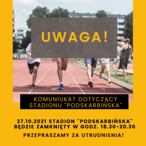 W dniu 27.10.2021 Stadion “Podskarbińska” nie będzie dostępny w godz. 18.30-20.30. Za utrudnienia przepraszamy.