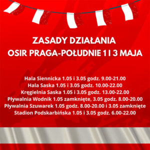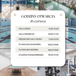 W dniu 8 czerwca Stadion “Podskarbińska” jest czynny w godzinach 6.00-22.00, a Pływalnia “Wodnik” w godzinach 8.00-20.00. Pozostałe obiekty w tym dniu są nieczynne.