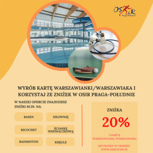 Sprawdź, jak uzyskać zniżkę 20% na wybrane usługi, m.in na: pływalnię, siłownię, badminton, ściankę wspinaczkową, tenis stołowy, kręgle.