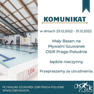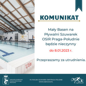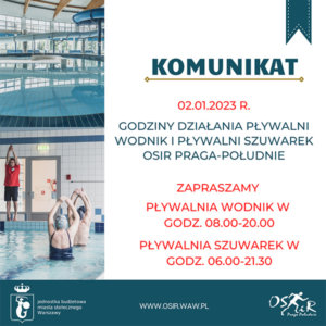 Informujemy, że w związku z przerwą w dostawie wody Pływalnia Szuwarek OSiR Praga-Południe będzie czynna w dniu 23 stycznia tylko do godziny 20.00.