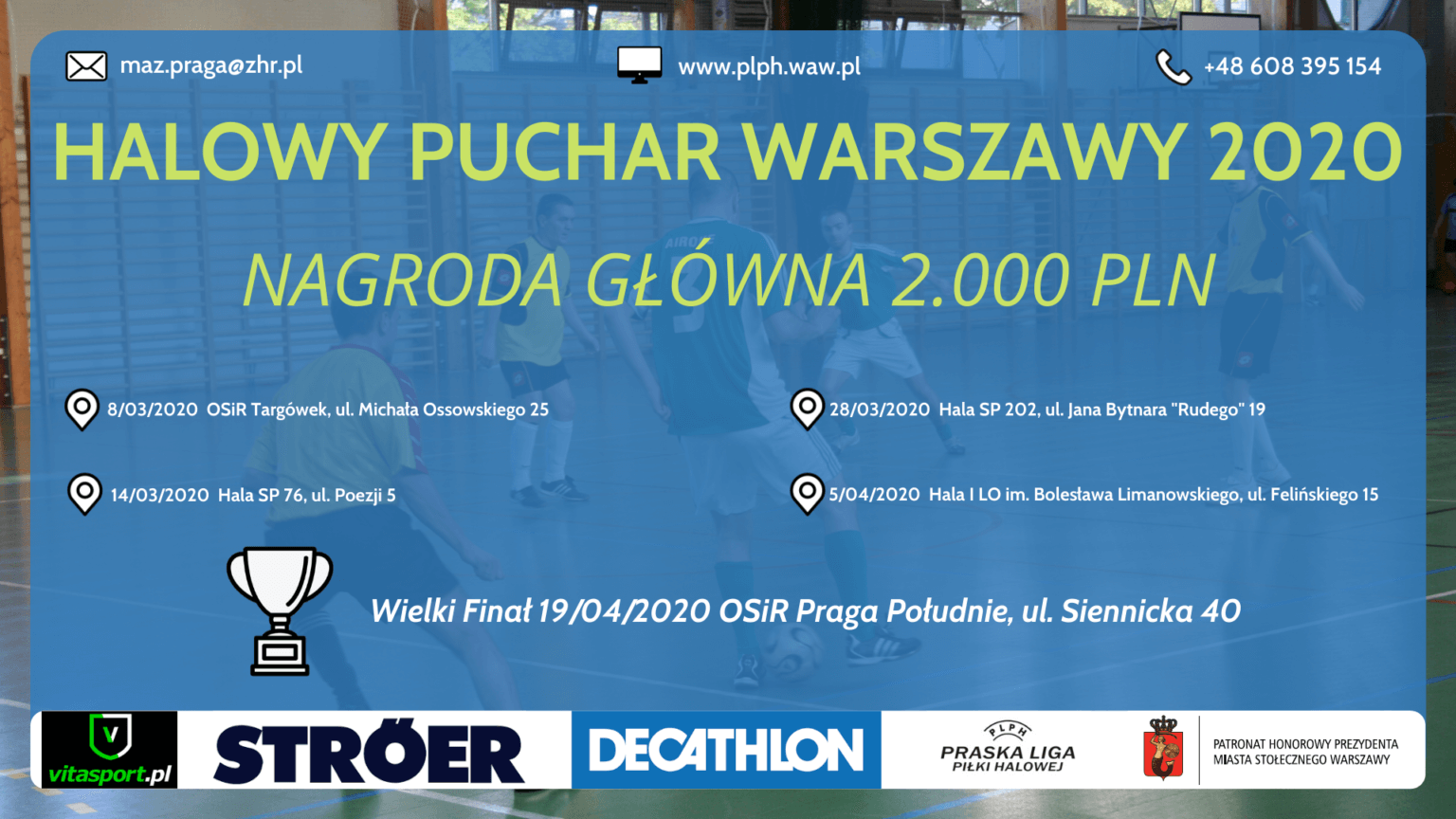 Praska Liga Piłki Halowej i OSiR Praga-Południe zapraszają na wielki finał Halowego Pucharu Warszawy 2020, który odbędzie się 19 kwietnia 2020 r. w Hali Sportowej “Siennicka” przy ul. Siennickiej 40.
