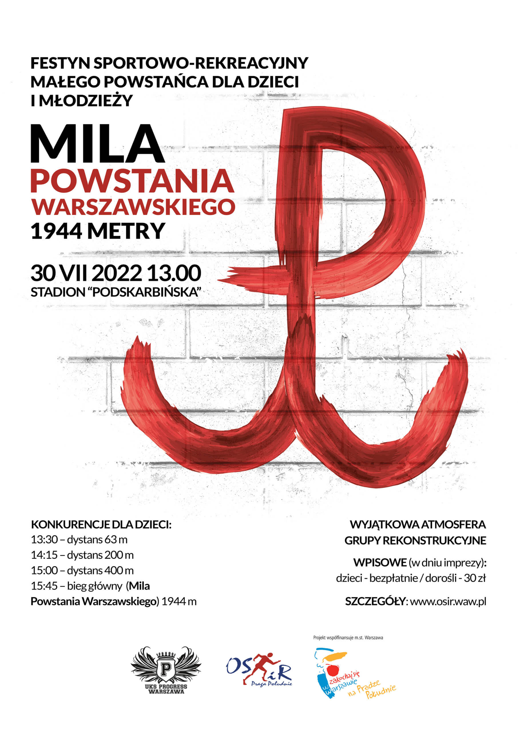 Wielkimi krokami zbliża się 78 rocznica wybuchy Powstania Warszawskiego. Z tej okazji w sobotę 30 lipca na Stadionie Podskarbińska, w godz. 13.00-17.00 zostanie zorganizowany festyn sportowo-rekreacyjny Małego Powstańca dla dzieci i młodzieży, w tym III edycja imprezy biegowej Mila Powstania Warszawskiego.