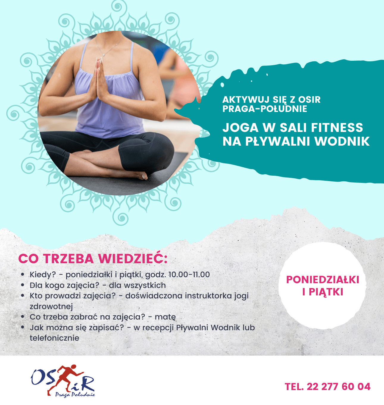 W poniedziałki i piątki 10:00 – 11:00, sala Fitness, na II piętrze Pływalni “Wodnik” OSiR Praga-Południe. Zajęcia prowadzi Ewa Schiller, licencjonowana nauczycielka jogi z wieloletnim doświadczeniem. Na zajęciach są realizowane wybrane i skuteczne ćwiczenia na kręgosłup, rozruch stawów, rozciąganie, techniki oddechowe i relaksacyjne.