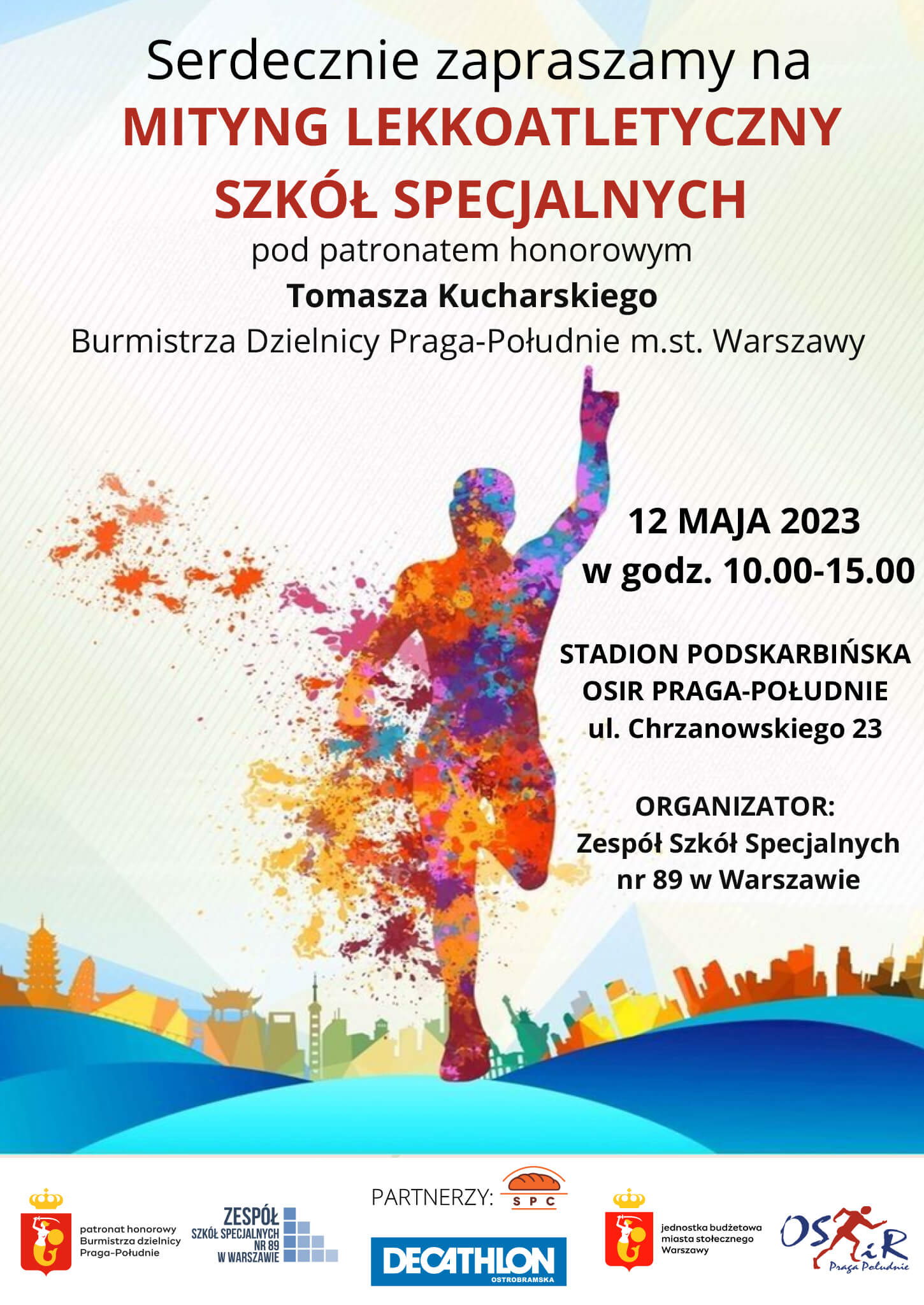 W dniu 12.05.2023 roku odbędzie się na Stadionie „Podskarbińska” OSiR Praga-Południe „Mityng Lekkoatletyczny Szkół Specjalnych” pod patronatem honorowym Tomasza Kucharskiego Burmistrza Dzielnicy Praga-Południe.