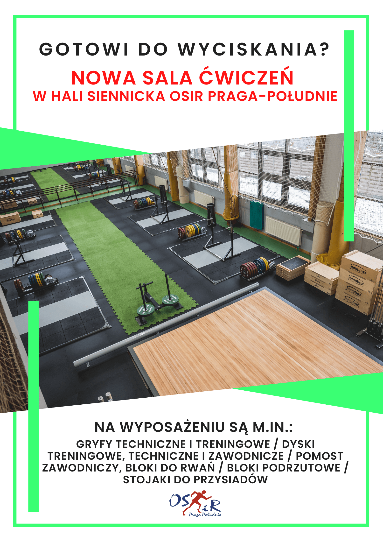 Od 1 grudnia w Hali “Siennicka” OSiR Praga-Południe działa nowa sala ćwiczeń z urządzeniami do podnoszenia ciężarów. Wejście na salę jest możliwe w ramach wejść i karnetów na siłownię. Kluby sportowe chcące korzystać ze sprzętu i ww. sali w celu dokonania wynajmu długoterminowego i podpisania umowy prosimy o zgłaszanie się do sekretariatu Hali Siennicka.