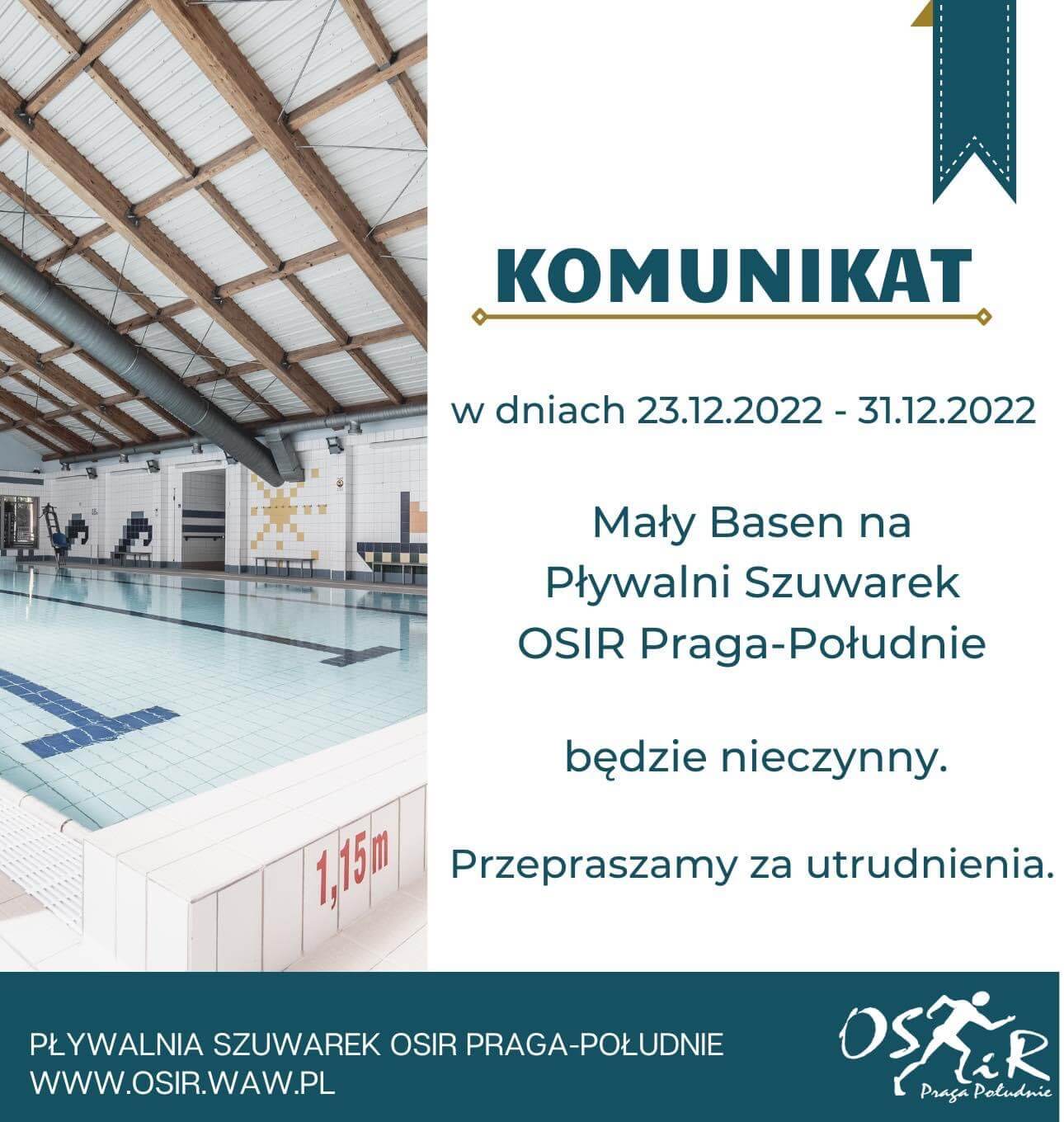 W związku z koniecznością wykonania prac remontowych w okresie od 23 do 31 grudnia br. mały basen Pływalni “Szuwarek” OSiR Praga-Południe zostanie wyłączony z eksploatacji. Jeżeli nie uda się zakończyć prac w ww. terminie zamknięcie małego basenu może się wydłużyć do 6 stycznia 2023. O takim fakcie będziemy informować przed zakończeniem roku.