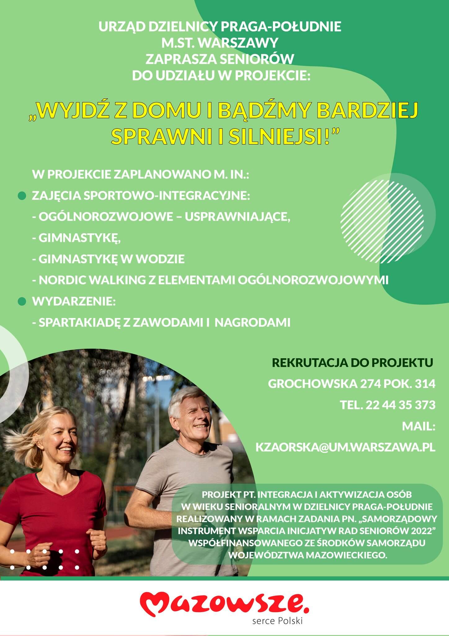 Projekt pt. Integracja i aktywizacja osób w wieku senioralnym w Dzielnicy Praga-Południe realizowany w ramach zadania pn. „Samorządowy Instrument Wsparcia Inicjatyw Rad Seniorów 2022” współfinansowanego ze środków Samorządu Województwa Mazowieckiego.