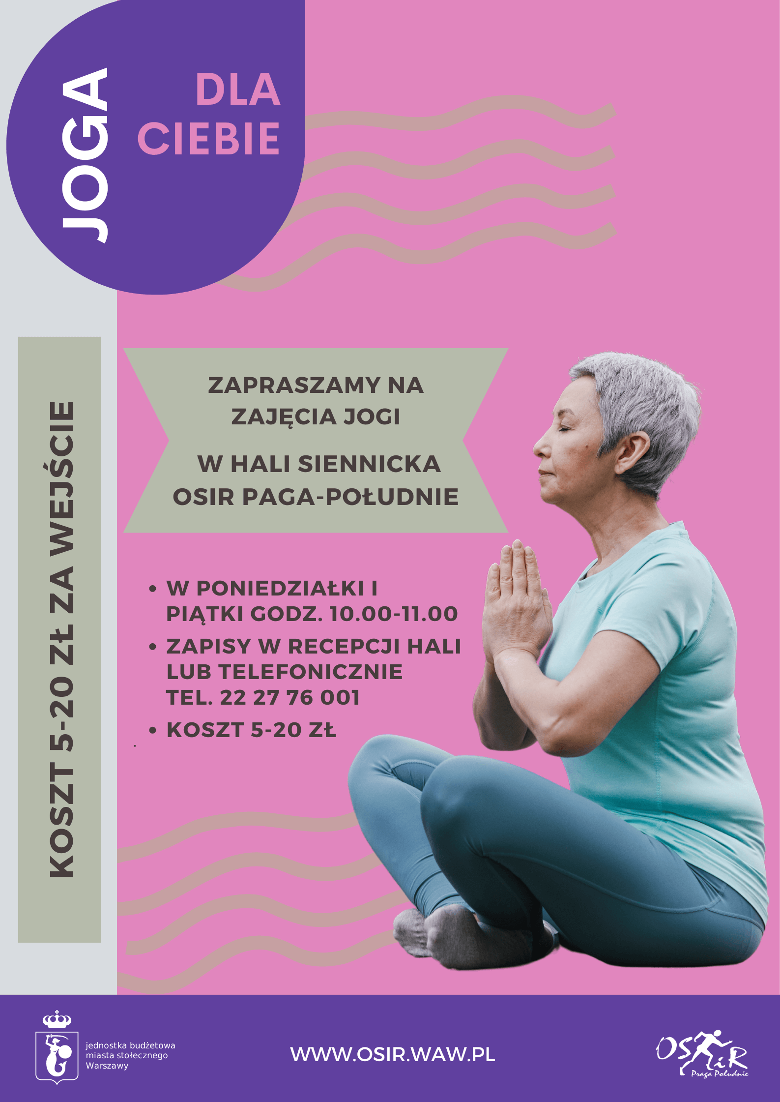 Praktykujesz jogę? A może szukasz powodu, by zacząć albo wrócić na matę? A może to będą Twoje pierwsze zajęcia z jogi? 9 stycznia ruszamy z kolejną edycją zajęć z jogi w Hali “Siennicka” OSiR Praga-Południe. Koszt wstępu wynosi 5-20 zł. Zajęcia odbywają się w poniedziałki i piątki, w godz. 10.00-11.00. Joga skierowana jest do wszystkich niezależnie od wieku. Zajęcia poprowadzi doświadczona instruktorka.