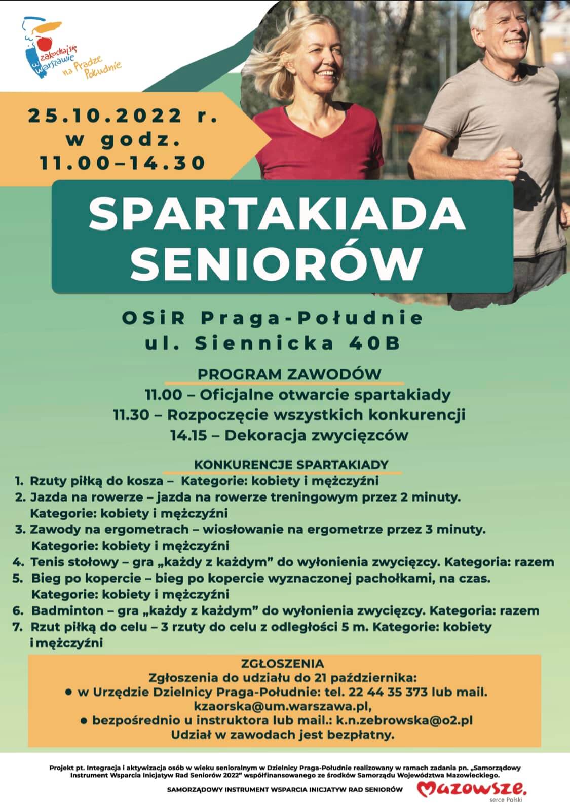 Zgłoszenia do udziału w wydarzeniu odbywają się do 21 października 2022 r. w Urzędzie Dzielnicy Praga-Południe pod numerem telefonu 22 44 35 373 lub mailem kzaorska@um.warszawa.pl. Udział w zawodach jest bezpłatny.