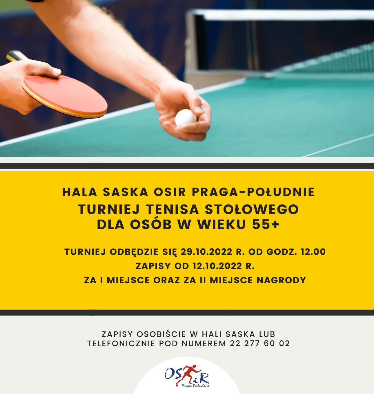 Zapraszamy na Turniej tenisa stołowego, który odbędzie się 29.10.2022 r. w Hali “Saska” OSiR Praga-Południe. Zapisy trwają od 12.10 telefonicznie pod numerem 22 277 60 02 lub osobiście na recepcji hali. Turniej będzie rozgrywany w systemie pucharowym. Uczestnikami turnieju mogą być osoby w wieku 55+. Udział w turnieju jest bezpłatny. Za zajęcie I miejsca będzie nagroda 10h gry bez opłat, a za zajęcie II miejsca nagroda 6h gry bez opłat – do wykorzystania w ciągu 30 dni.