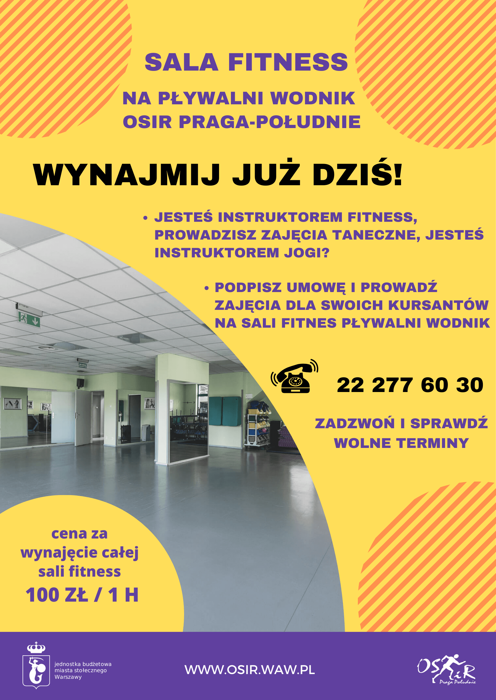 Zapraszamy przedsiębiorców i instytucje, szkoły, organizacje pozarządowe i podmioty, o których mowa w art. 3 ust. 3 ustawy z dnia 24 kwietnia 2003 r. o działalności pożytku publicznego i o wolontariacie (Dz. U. z 2016 r. poz. 1817, z późn. zm.) działające w obszarze sportu i rekreacji do skorzystania z naszej oferty wynajmu sali fitness na Pływalni Wodnik OSIR Praga-Południe. Sala posiada okna i lustra oraz jest bardzo jasna. Koszt to 100 zł brutto ( w tym 23% VAT) za 60 minut. Pływalnia Wodnik, znajduje się w bardzo dogodnej lokalizacji dla mieszkańców Gocławia i Pragi-Południe, a ponadto dysponuje bezpłatnym, niestrzeżonym parkingiem na 70 miejsc samochodowych i 10 miejsc rowerowych oraz bezpłatną szatnią. Zapraszamy do kontaktu i współpracy. Telefon 22 277 60 30.