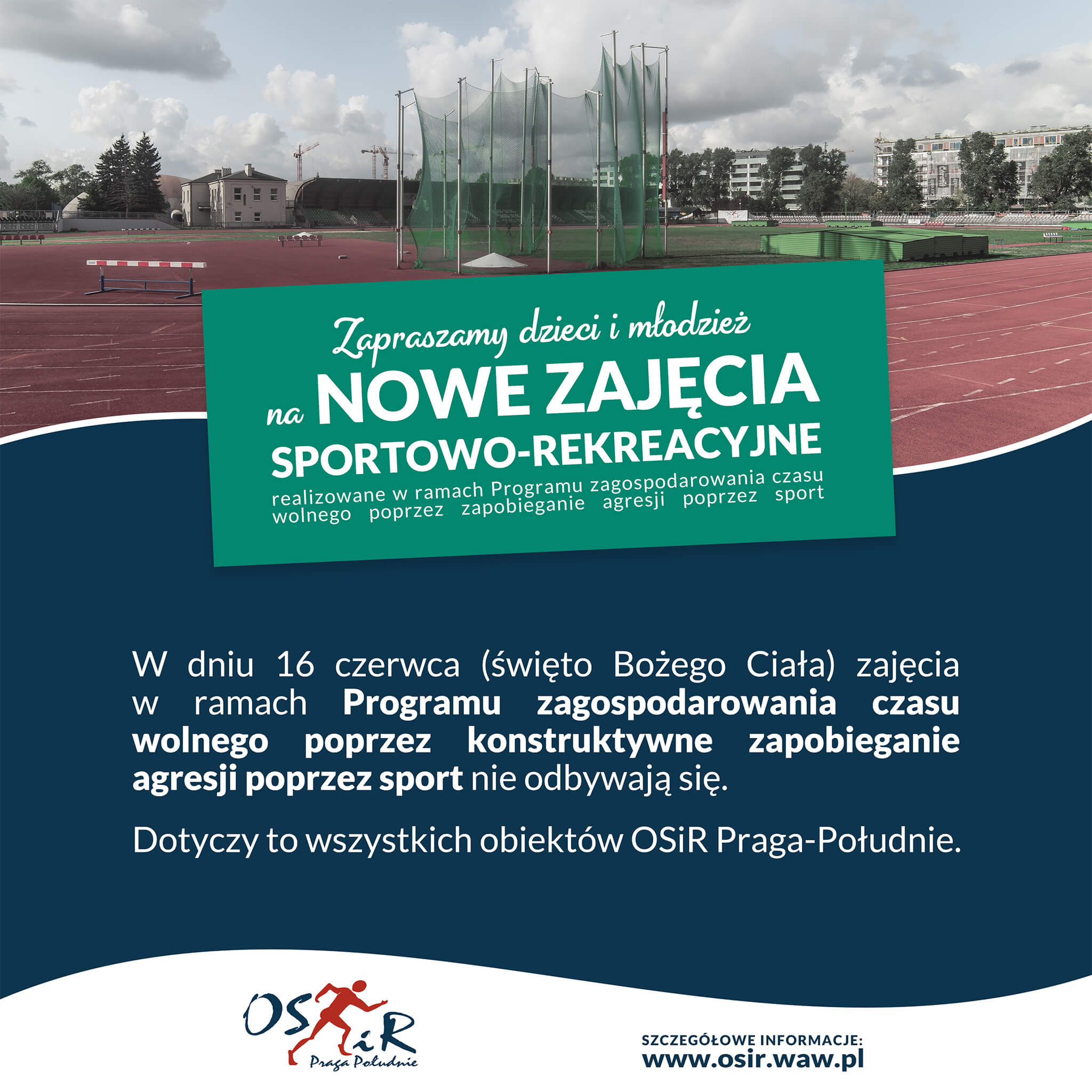 W dniu 16 czerwca (święto Bożego Ciała) zajęcia w ramach Programu zagospodarowania czasu wolnego poprzez konstruktywne zapobieganie agresji poprzez sport nie odbywają się.