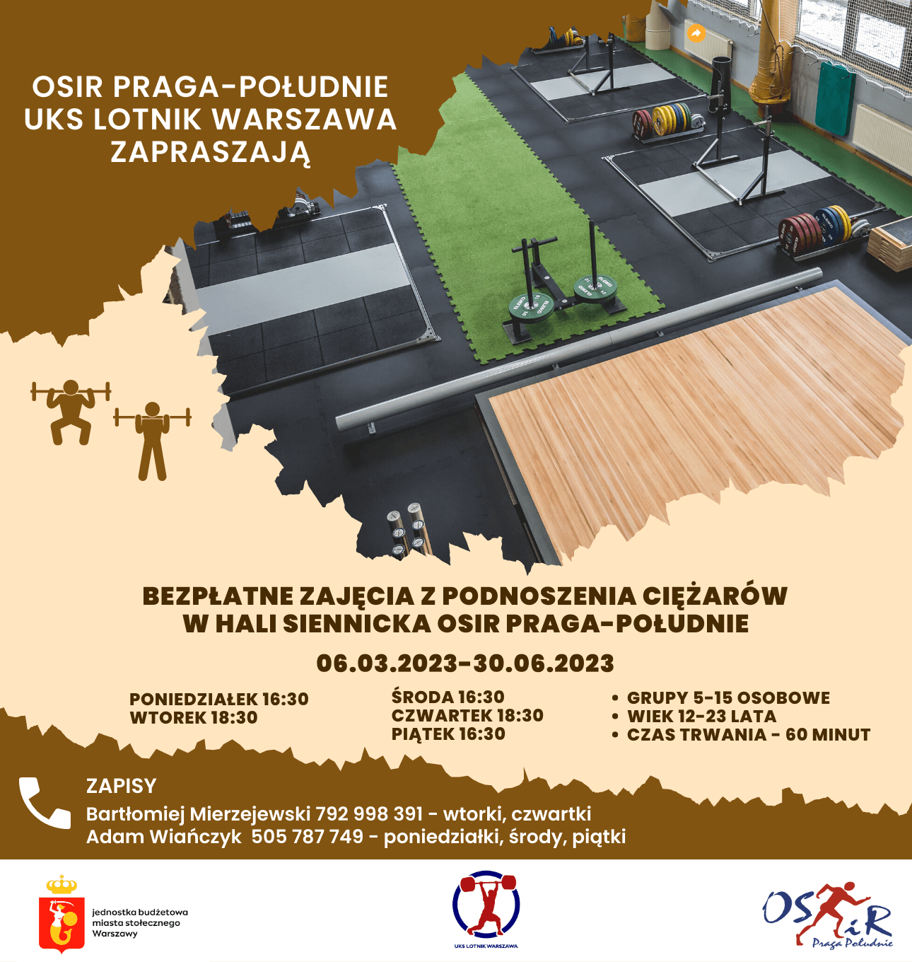 Zapraszamy do skorzystania z nowej oferty w Hali Siennicka OSiR Praga-Południe. W ramach współpracy OSiR Praga-Południe z UKS Lotnik Warszawa zorganizowane są bezpłatne zajęcia z podnoszenia ciężarów. Są one prowadzone 5 dni w tygodniu dla osób w wieku 12-23 lata. Każde zajęcia trwają 60 minut i są prowadzone w grupach 5-15 osobowych. Zajęcia będą realizowane do 30.06.2023 r.