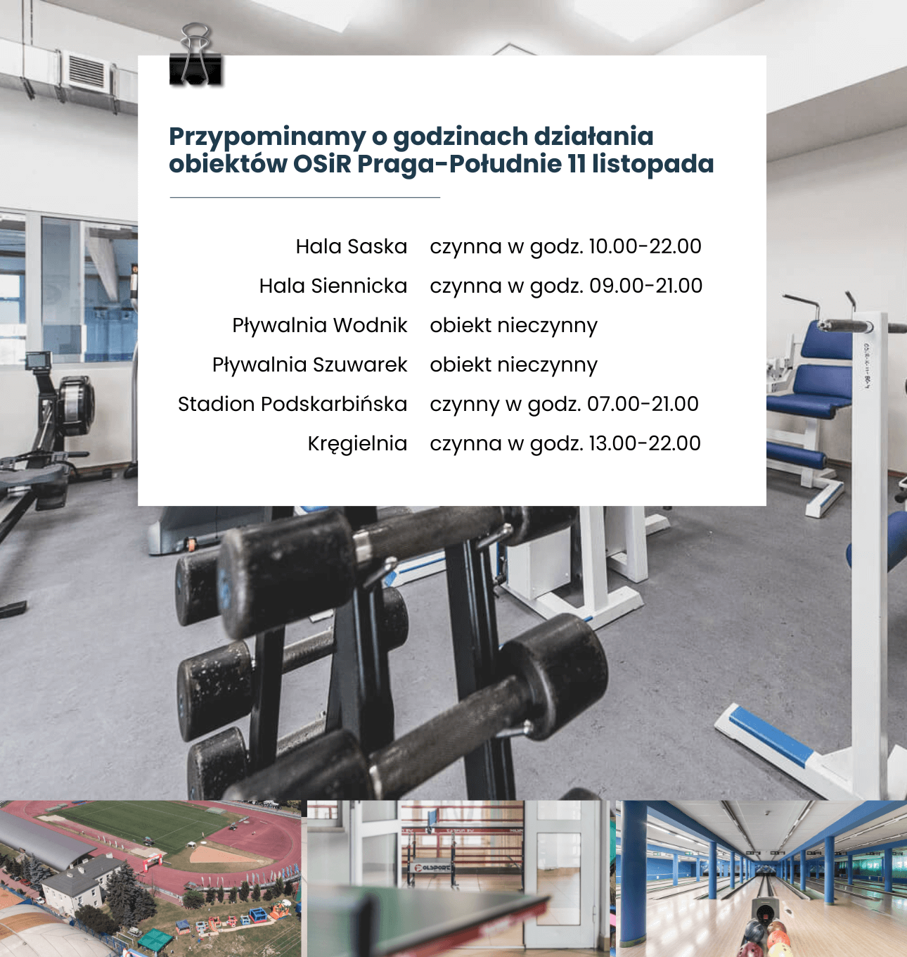 Szanowni Państwo, przypominamy o godzinach działania obiektów OSiR Praga-Południe w dniu 11 listopada: